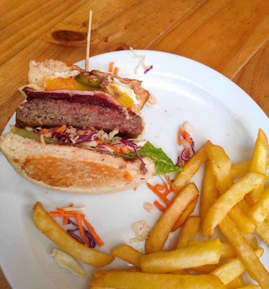今日の朝ご飯はチョコレート味のシリアルとウィンナーとかベーコンでした。昼ご飯は、お店でハンバーガーを食べました。