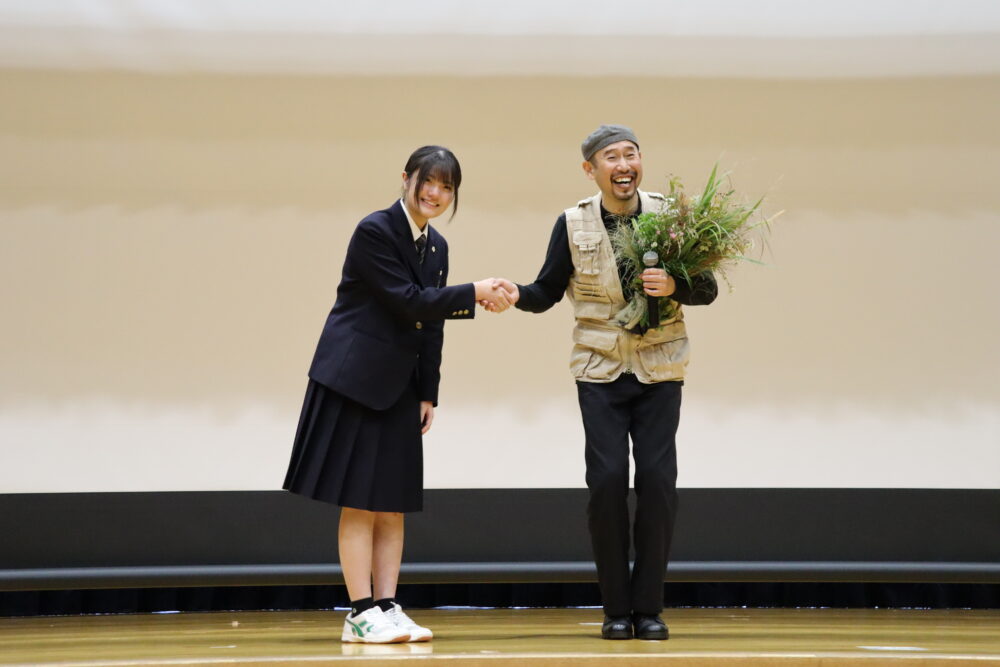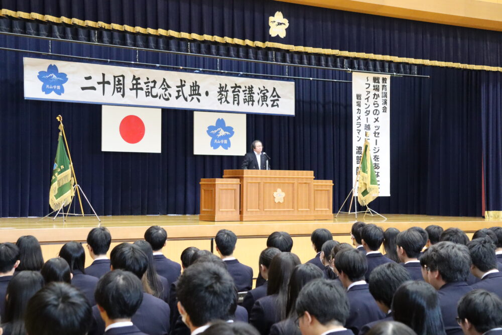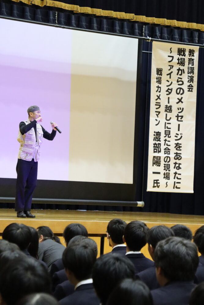 教育講演会では、戦場カメラマンの渡部陽一さんをお招きし、