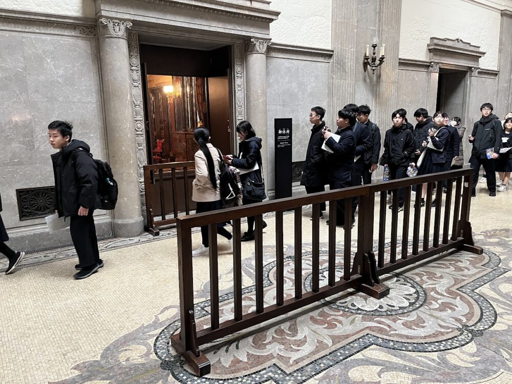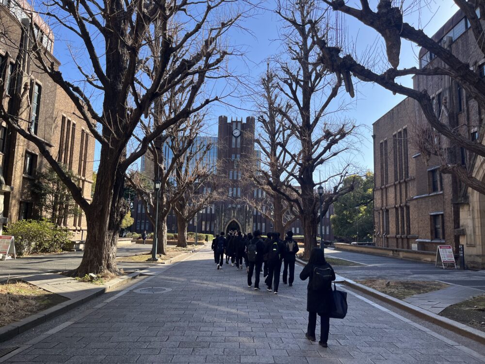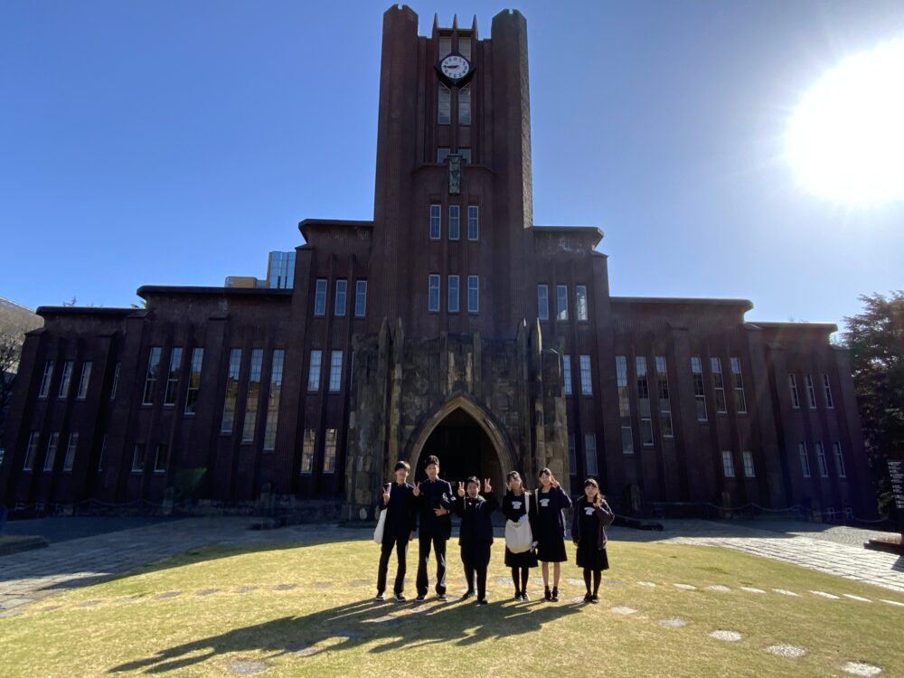 2日目は,まず全員で東京大学を訪れました。有名な「赤門」は,工事中でシートに覆われており「青門」状態のため残念ながら見ることができませんでした。安田講堂の前で記念写真を撮った後,班別行動に入りました。