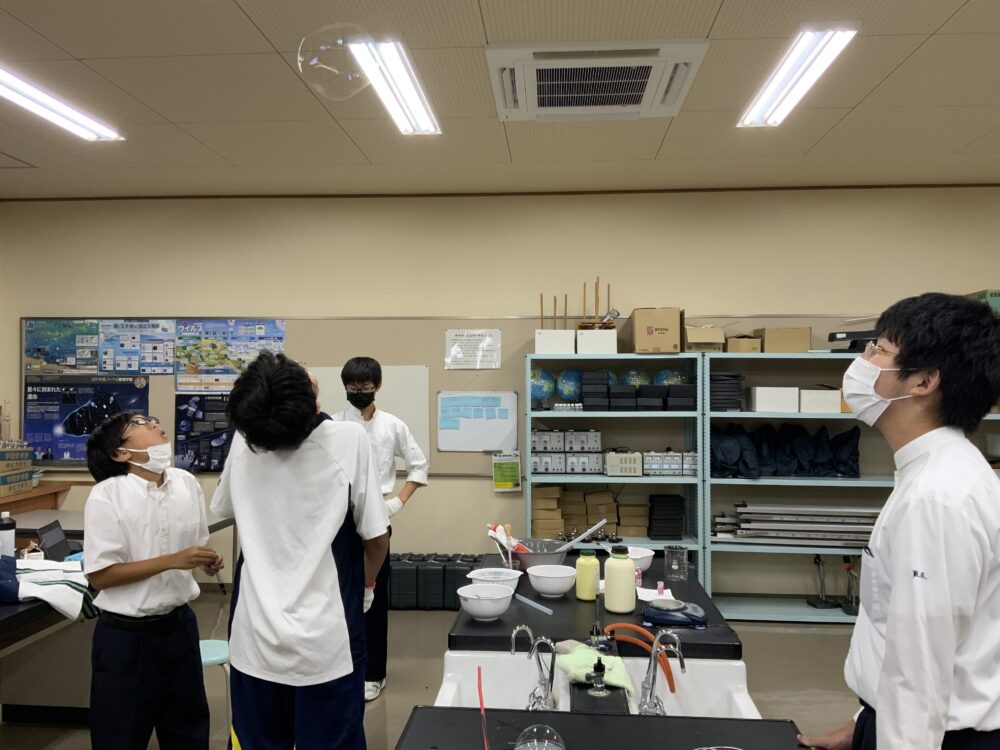 こちらのチームはシャボン玉を浮かべているようです。薬品が色々並んでいますが、どうやらとても丈夫なシャボン玉が作れる「秘伝のレシピ」を研究しているようです。